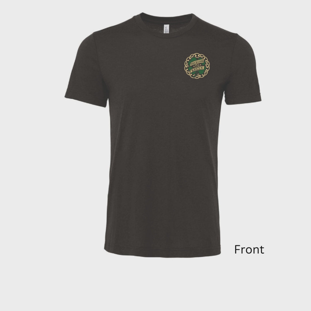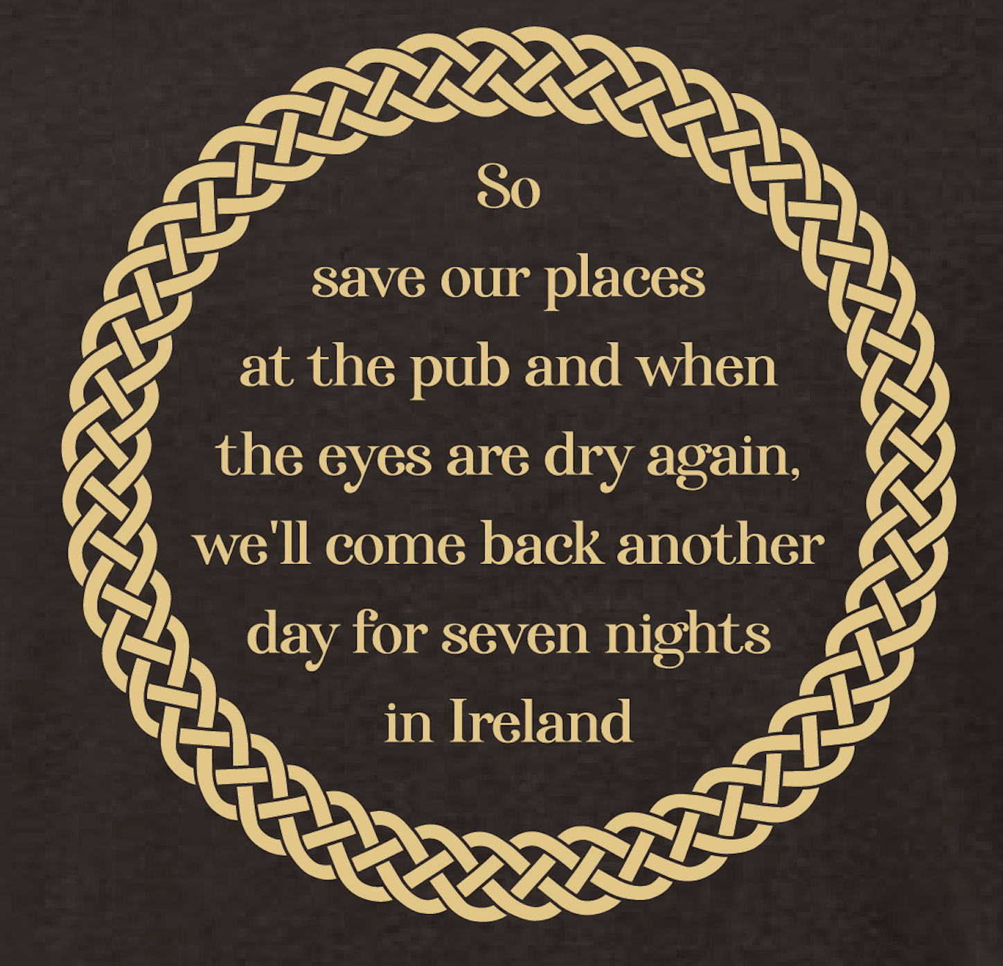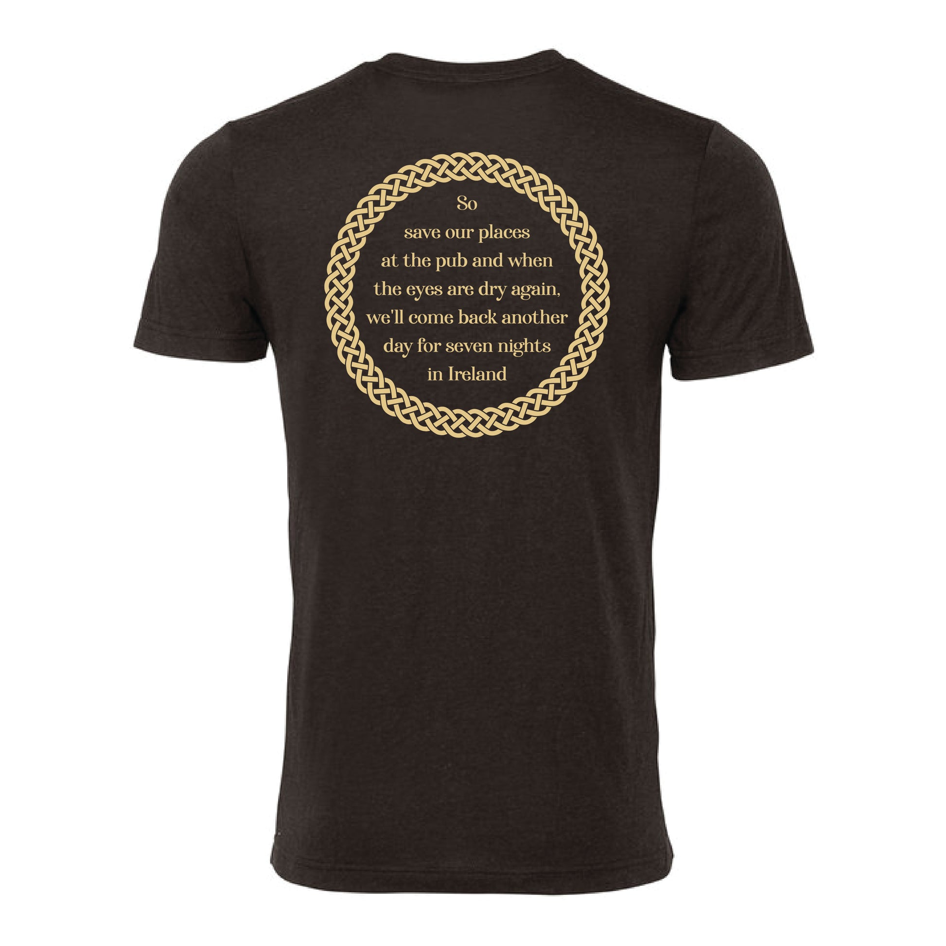 0ur 2023 version of the 7 Nights in Ireland tee shirt featuring a shamrock design on the chest pocket on the front and lyrics on the back side wrapped in a keltic design.