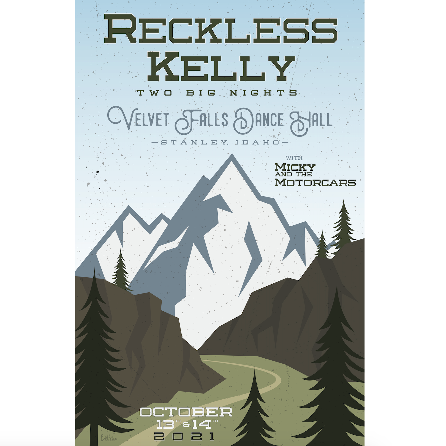 Reckless Kelly's official posters for their October 13th & 14th shows at the Mountain Village Velvet Falls Dance Hall in Stanley, ID.