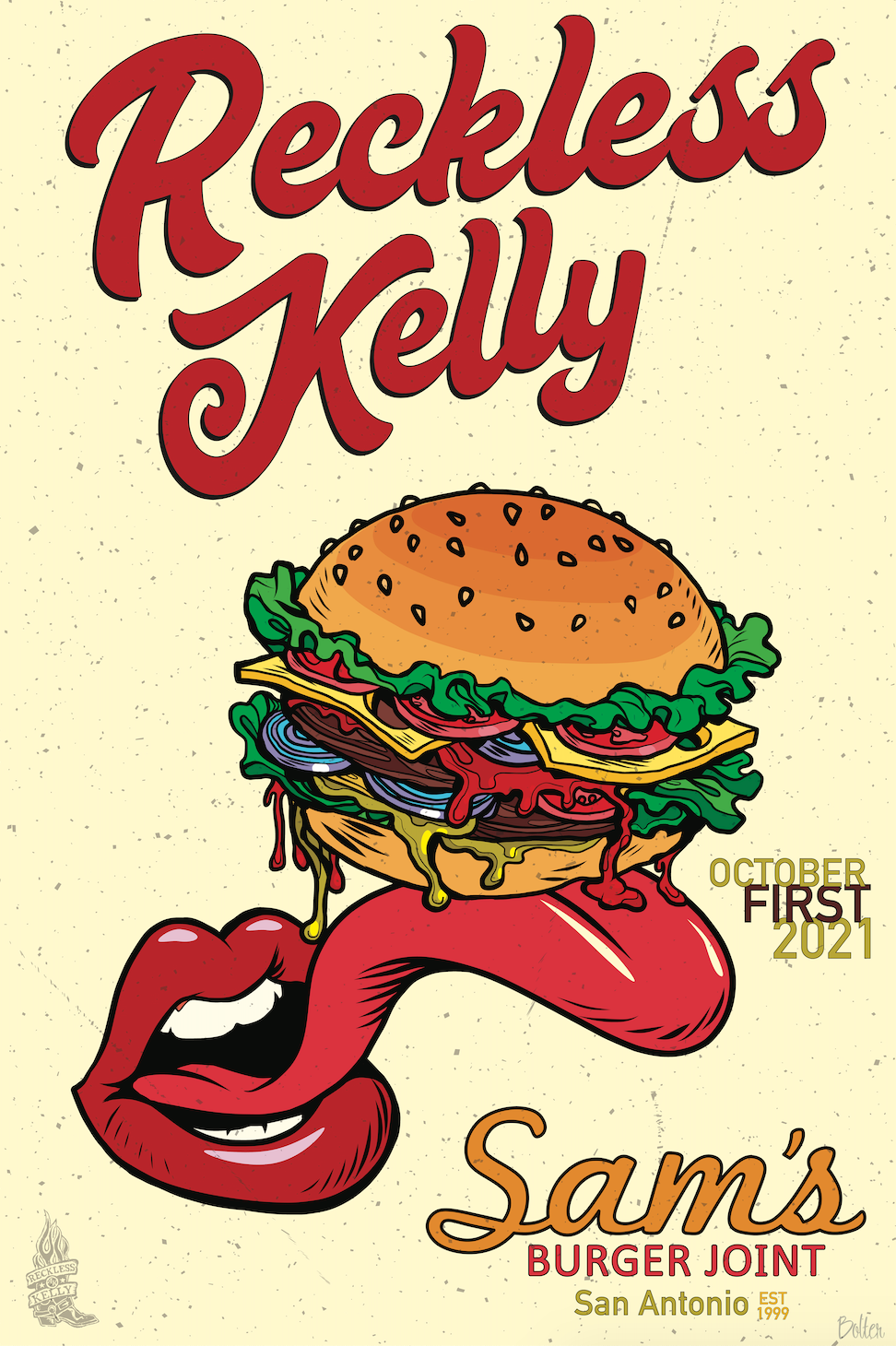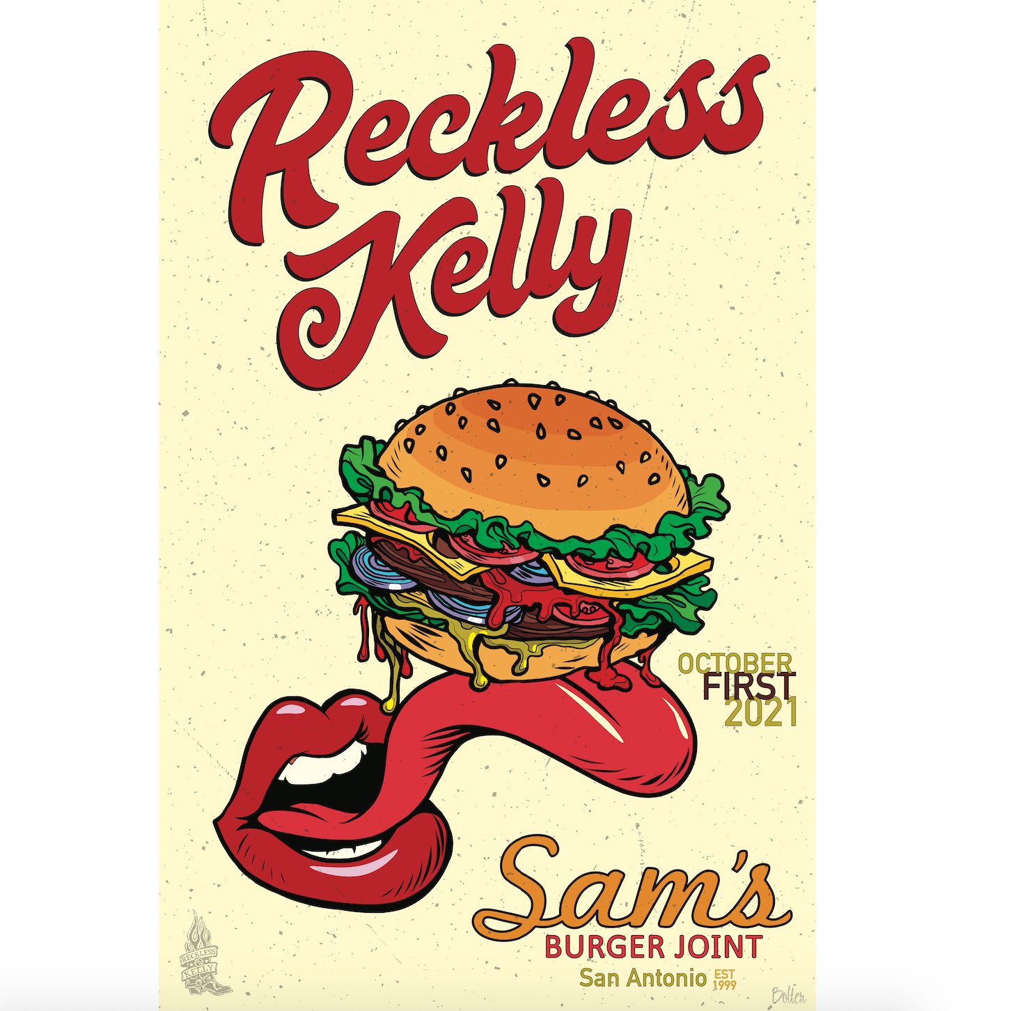 Reckless Kelly's official poster for their October 1st, 2021 show at Sam's Burger Joint in San Antonio, TX.