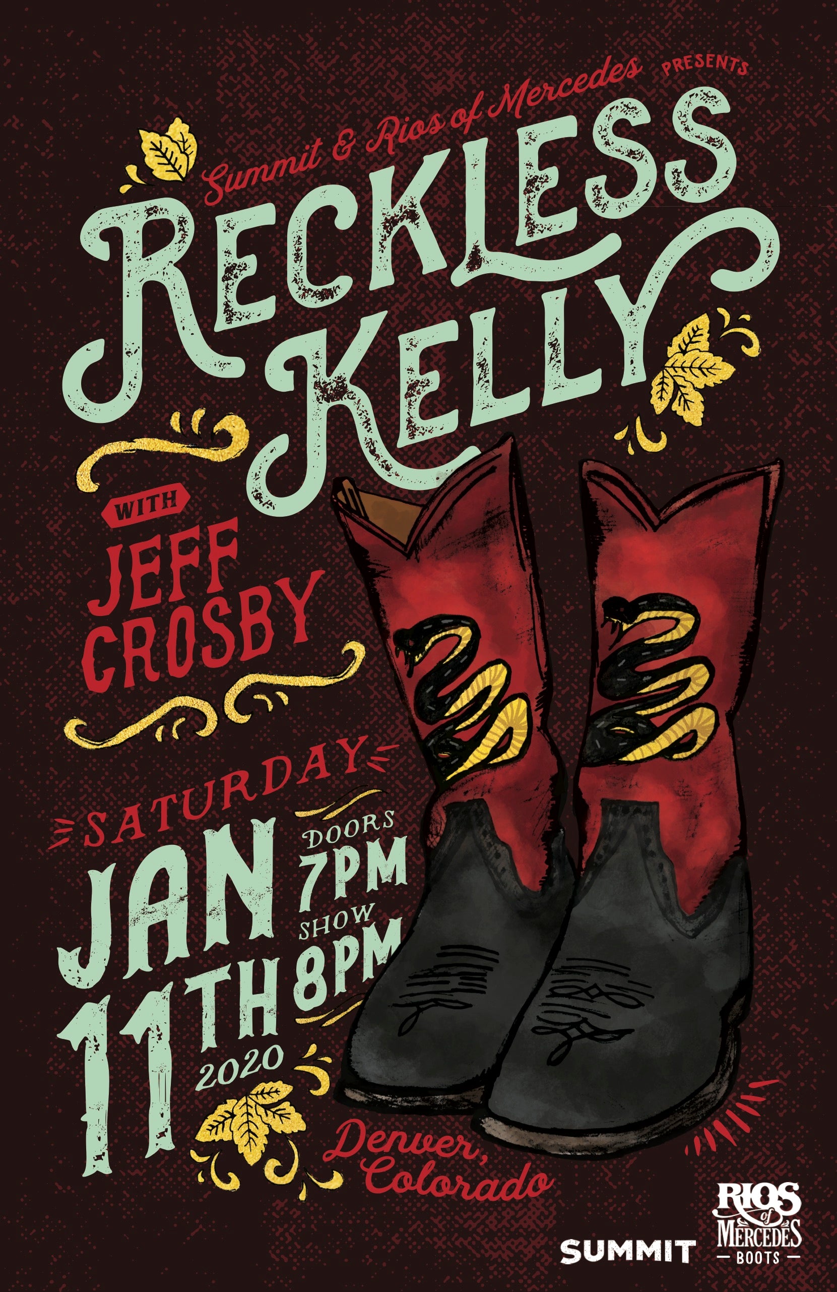 Reckless Kelly's official poster for their January 11th show presented by Summit and Rios Of Mercedes Boots in Denver, CO.
